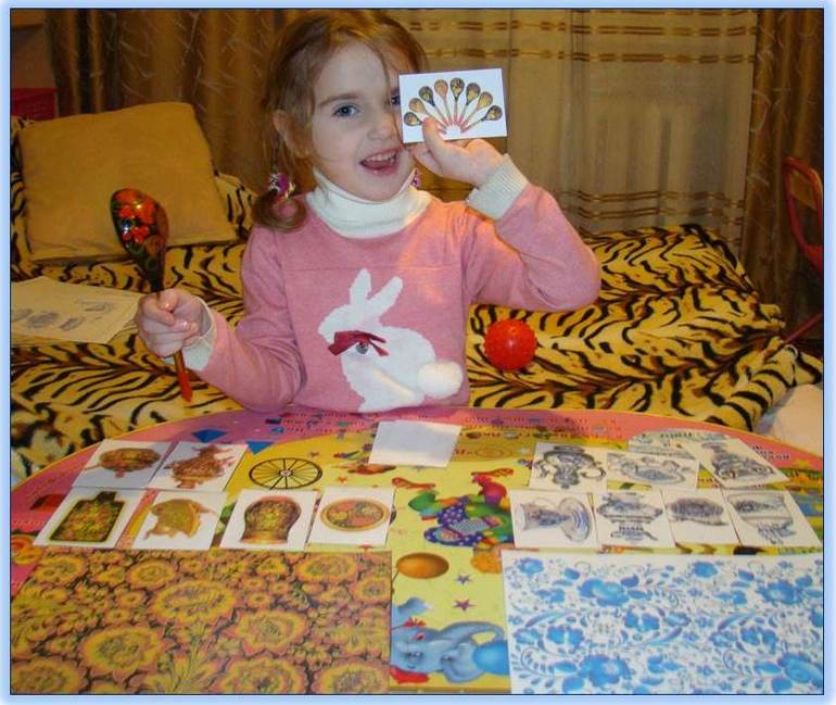 Но чтобы всё это есть, нужна посуда. Посуда раньше была незатейливая - деревянная и глиняная, рассмотрели, как раньше эту посуду украшали (росписи гжель - глиняная посуда и хохлома - деревянная посуда). Рассортировали карточки с посудой: