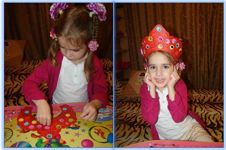 Но платок - это ни что по сравнению с кокошником. Кокошник - это роскошное украшение, которое надевали только на праздник. Поэтому нам тоже нужен кокошник - украсили его цветами и декоративными камешками.