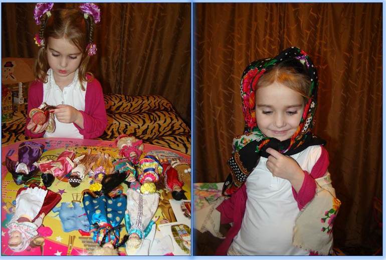 Сначала я рассказала Даше о том, что раньше в нашей стране люди одевались по другому, девочки никогда не носили штаны . (Даша узнав об этом пришла в восторг, она ненавидит штаны, только платья, платья… болеем платьями). Рассмотрели одежу на фигурках, на куклах фарфоровых, рассказала о том, как называлась одежда - собрали пазл самодельный.