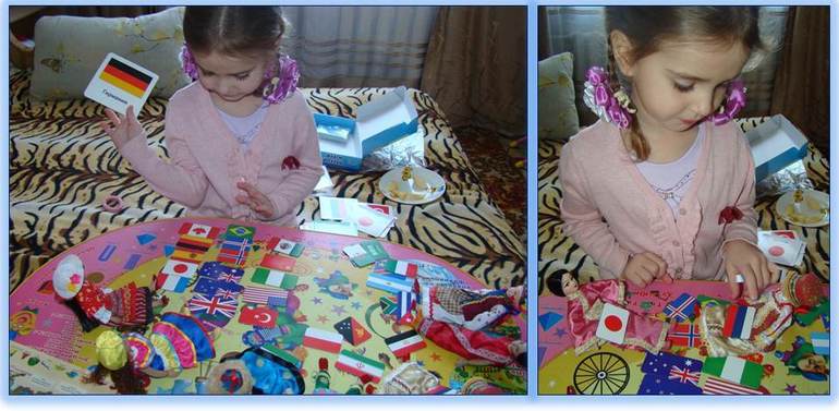 А потом приступили к изучению российской символики. Я рассказала Даше, что у каждой страны есть свои собственные флаг и герб, которые помогают отличать их друг от друга. Вот, например, у нас состоялся конкурс красоты, на который приехали девочки из разных стран (фарфоровые куколки в костююмах), все они такие разные, но чтобы их легче было отличить узнать, кто из какой страны приехал, каждая куколка взяла с собой на конкурс флаг своей страны. А мы с Дашей заодно и рассмотрели эти флаги, сравнили, чем они отличаются, нашли наш - Российский флаг . Даша решила, что наш флаг самый красивый, ну и испанский, японский - тоже ничего. А вот у Германии флаг не gut …