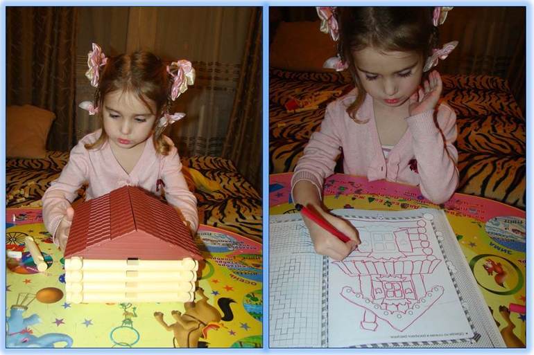 Но люди на Руси не только одевались по другому они и жили по-другому. Во- первых, дома раньше были не кирпичными и многоэтажными, а деревянными и назывались они избой. Мы с Дашей сложили свою избу из бревнышек - а я по ходу рассказывала о том, что избушки были разборными (в случае переезда их могли перевозить с собой), что строили их без гвоздей и т.п. Затем мы нарисовали избушку ...