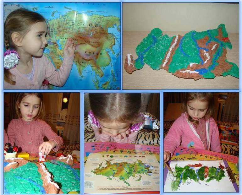 Начали мы с географического положения - я рассказала Даше, что Россия - это самая большая страна в мире, мы нашли её на нашей карте, заштриховали и сравнили с другими странами - Италией, Турцией, убедились, что разница в размерах просто огромная. А раз наша страна такая большая, то в ней, наверняка, много всяких интересностей. Чтобы было понятнее и нагляднее, за пару часов коллективного труда мы с Дашей соорудили небольшой макет нашей страны и внимательно рассмотрели, что в нашей стране есть - горы, реки, самое глубокое озеро - Байкал. А потом Даша нарисовала свою карту с самыми крупными реками и с самыми большими горами. (Уральские горы нам почему-то запомнились лучше всех!!!)