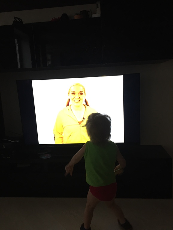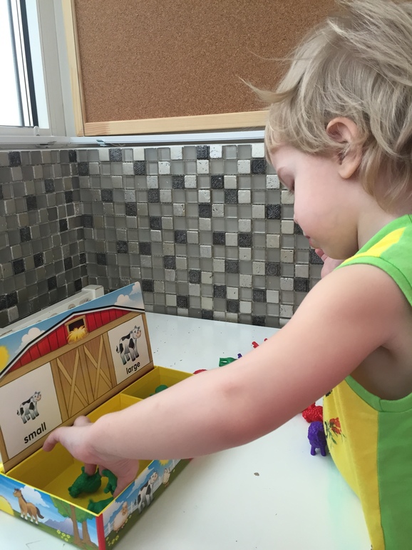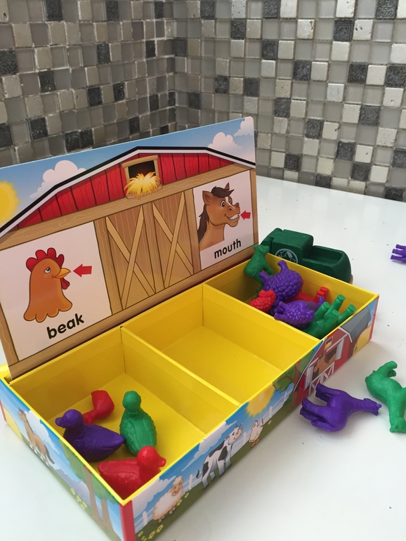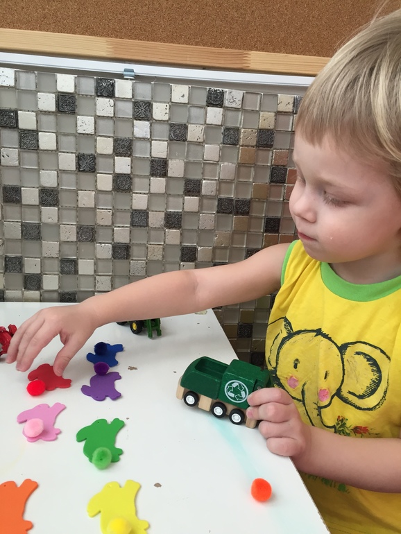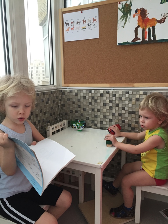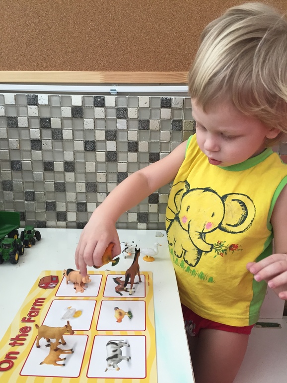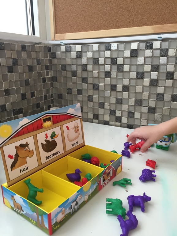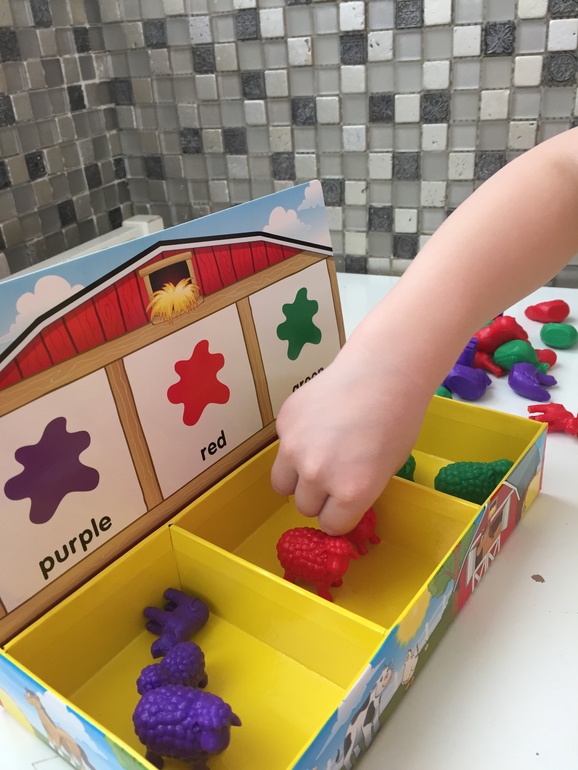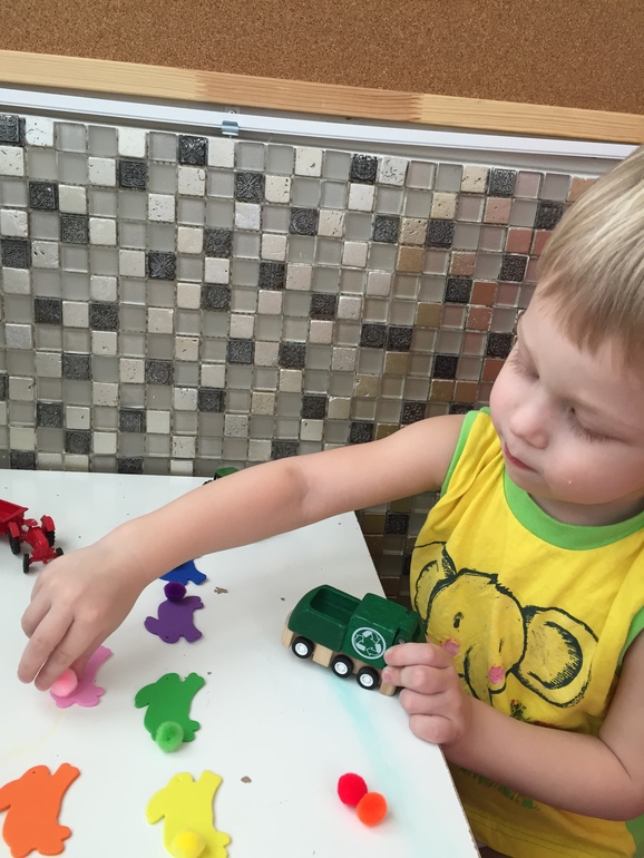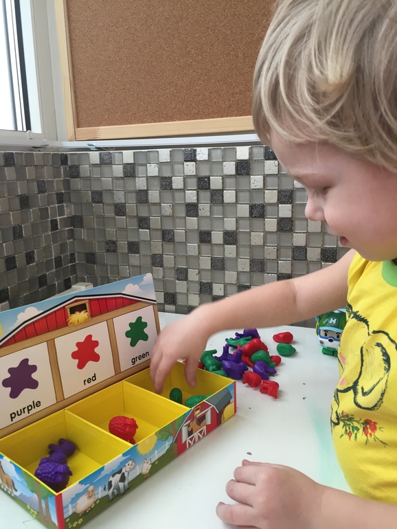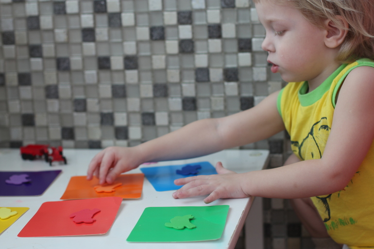 Машуля придумала братику игру - нанизывать резиночки для волос на животных подходящего цвета)