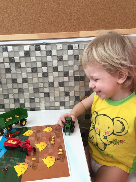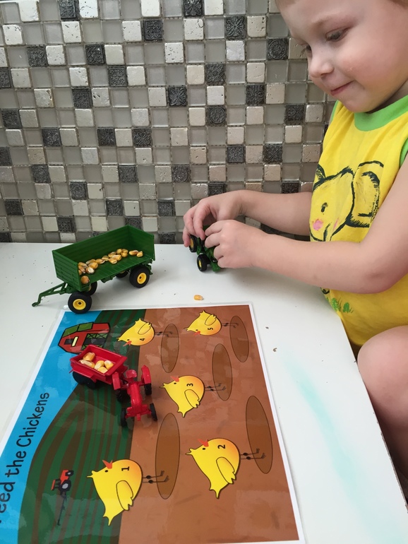 а потом трактор привез зернышки для цыплят, и Степа помог накормить малышей, посчитав зернышки
