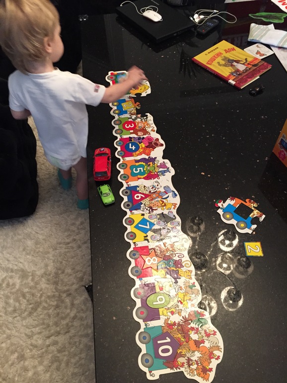 далее был длинный предлинный пазл, собирали паровозик вместе, повторили геометрические фигуры, обсудили кто едет в вагончиках