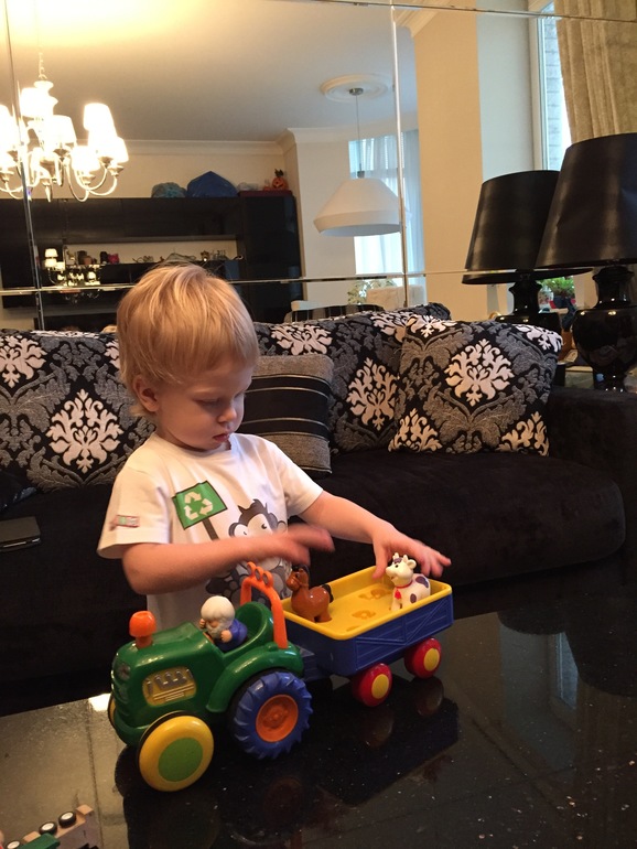 этому трактору тоже лет 5, мы его очень любим, он издает звуки "работающего трактора", животные говорят на своем языке, а фермер за рулем поет веселую песенку "old macdonald"