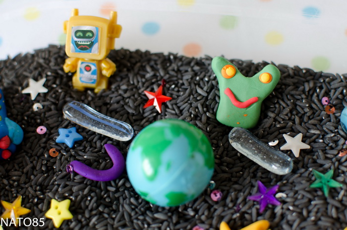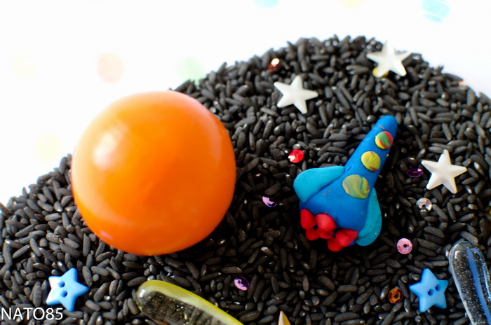 Слепила несколько инопланетян из полимерной глины и ракету для запуска, Сатурн из шарикового пластилина, пуговки, стекляшки в виде комет и схематично еще некоторые планеты - думала Лиза не признает их, ан нет!