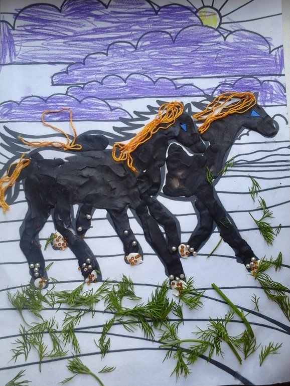 реально иногда меня бесит пытливый ум детский)))) ну скорее всего, потому что эта черта обязательно подкрепляется бардаком из-за активного самостоятельного поиска ответа на свои вопросы))) Так вот: яхонты это или рубины или сапфиры, последние как раз вставлены в серьги мои. Затем нашли описание коней из сказки, прочли что там еще упомянут жемчуг и алмазы, нашли в маминых украшениях и эти каменья. перемеряли все драгоценности за одно)) И как-то само собой получилась у нас вот такая картина: