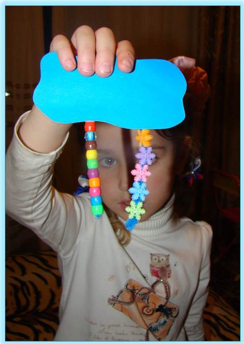 Я рассказала Даше, что в тучке капельки собираются всегда: и зимой, и летом. Только летом, капелькам ничего не мешает и падая на землю, идёт дождь. А зимой от холода капельки замерзают и превращаются в снежинки. То есть, можно сказать, так, что существует летний дождик и зимний дождик - снег. Это мы и сделали - на одну веревочку нанизали бусинки - капельки, а на другую - снежинки: