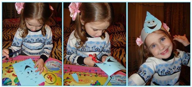 Начали мы с того, что превратили Дашу в капельку - то есть сделали для неё маску капельки - Даша обвела капельку по точкам, вырезала её и мы приклеили нашу капельку к картону. Всё! Маска готова - теперь Даша - настоящая маленькая капелька!