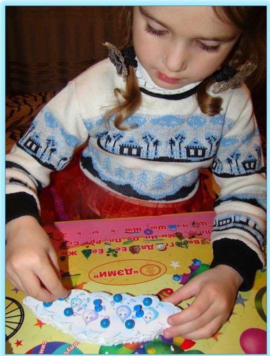 Но где же её друзья, братики и сестрички, ведь у воды много капелек, куда же все остальные капельки попрятались? Я рассказала, что капельки живут в облачке - облачко летает по небу и собирает много-много разных капелек. Помогли нашему облачку собрать капельки -воткнули в облачко синие кнопочки - "капельки":