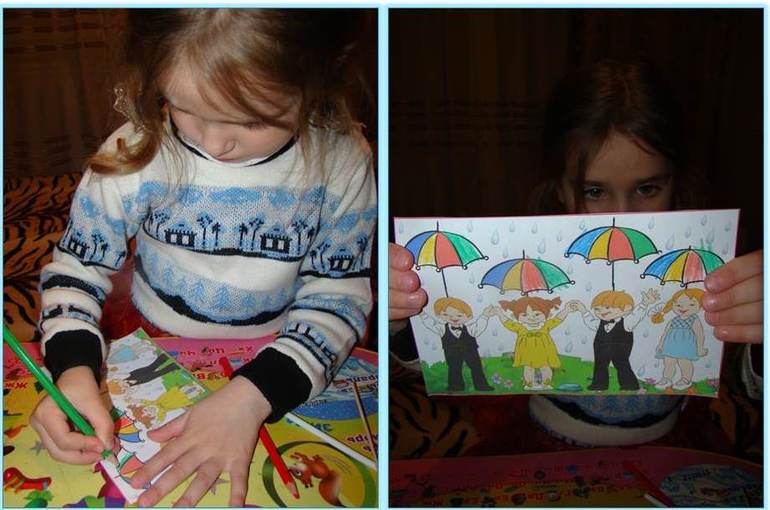 Дождик пошёл и теперь нам нужно помочь деткам спрятаться от дождя и нарисовать для них одинаковые зонтики. Здесь Дашина задача состояла в том, чтобы, ориентируясь на образцы, раскрасить пропущенные полосочки на зонтике в нужный цвет: