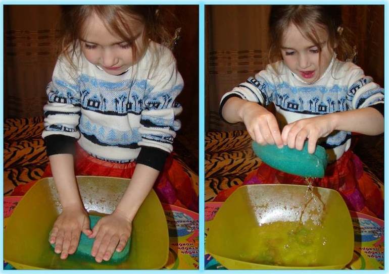 И вот теперь, когда капелек в нашем облачке стало много, облако стало тёмным, тяжелым и превратилось в тучу. Туче тяжело носить с собой столько капелек, поэтому она выбрасывает их на землю (сначала одну капельку бросает , потом вторую, как-кап…) и так идёт дождик. Мы посмотрели, как это происходит на практике - взяли синюю губку - это облако - облачко собирало капельки в миске - а потом, когда капелек собралось много, губку выжимаем- и идёт дождик, как из тучки: