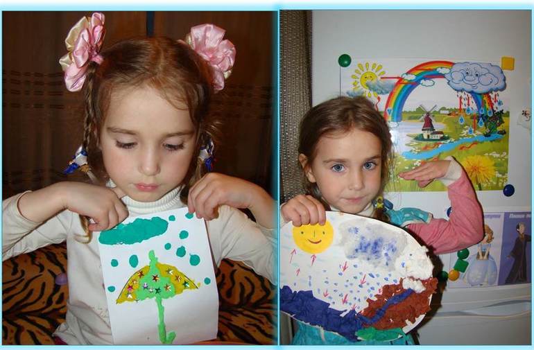 Также сделали две поделки : зонтик из пластилина и поделка из мятых салфеток , на которой показан круговорот воды в природе (облачко из ваты, дождик рисовали ватными палочками, клеили салфетки - горы и речка, разрезали солнышку лучики, Даша рисовала пар - кружочки):