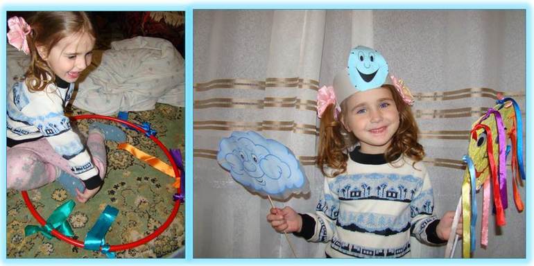 Весь этот процесс мы обыграли так: Даша -капелька упала в лужу (сидим на полу), потом я брала обруч с привязанными ленточками - это солнышко и протягивала лучики - ленточке Даше. Дашина задача была поймать лучик, подпрыгнуть (превратиться в пар) и после этого солнышко помогало Даше оказаться на облачке - на одеяле: