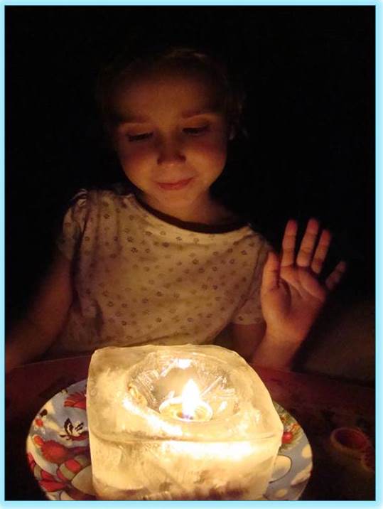 Ну и напоследок я рассказала, что зимой капельки также могут превращаться в лёд. А чтобы наши капельки расколдовать и снова выпустить наружу - мы зажгли свечку и пронаблюдали, как лёд тает:
