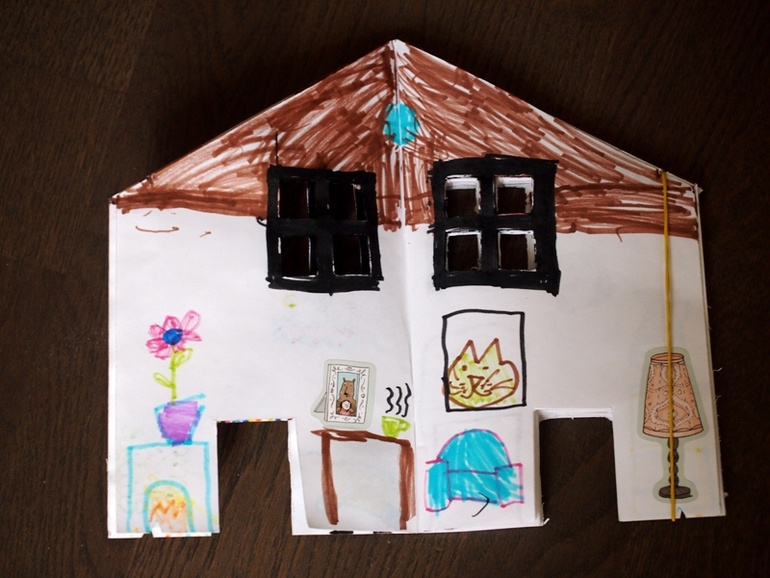 Ребенок с энтузиазмом рисовал интерьеры используя оставшиеся наклейки из журнала и свою фантазию
