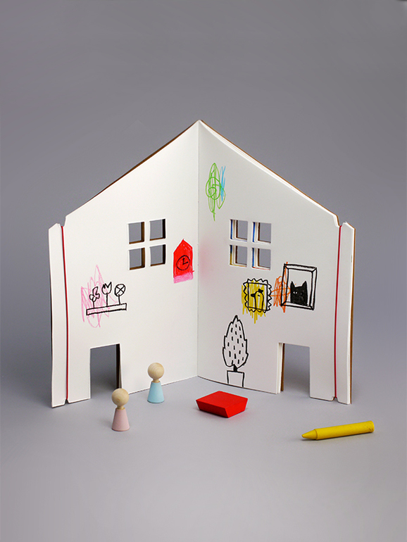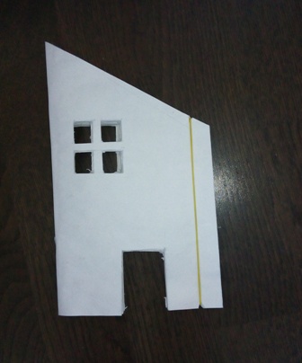 Вырезала окошки тем же способом и двери. Закрепила с другого конца получившегося домика листы резиночкой.
