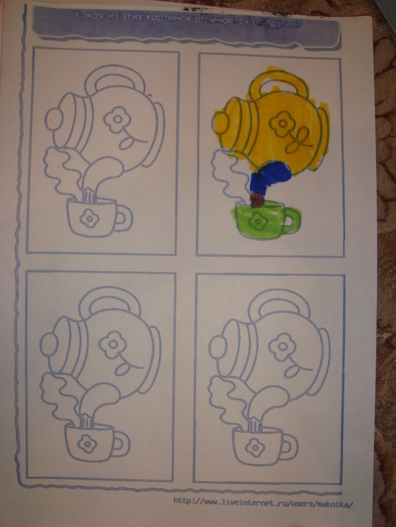 Здесь нужно было найти картинку, которая отличается от остальных и раскрасить