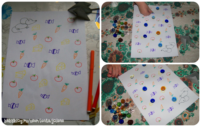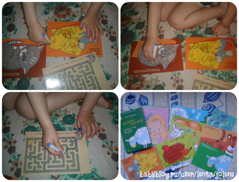 Сделали несколько заданий из набора "Каляки-маляки": Мир рисовал дырки в сыре, шерсть коту и дорожку для мышонка по лабиринту.