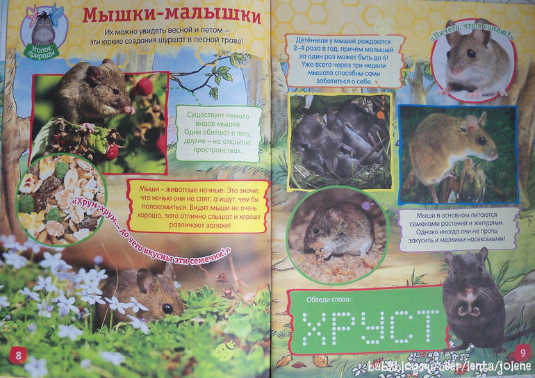Немножко углубились в теорию - посмотрели, какие бывают мышки, обсудили фото мышей. Рассмотрели разворот из журнала "Винни Пух" про мышей.