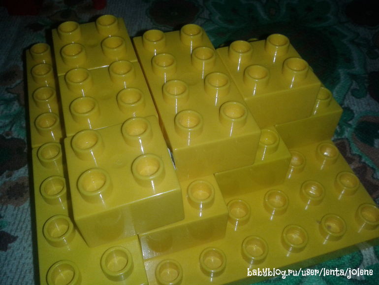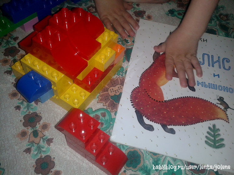 Когда, закончили с лепкой, почитали электронную книжку про Груффало, а потом решили сделать мышонку сыр из конструктора.