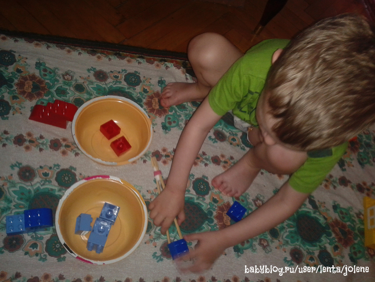 Покормили мышонка и лиса, предварительно рассортировав по цвету еду в разные миски, а чтоб интереснее было, я дала Миру сортировать учебными палочками для суши.