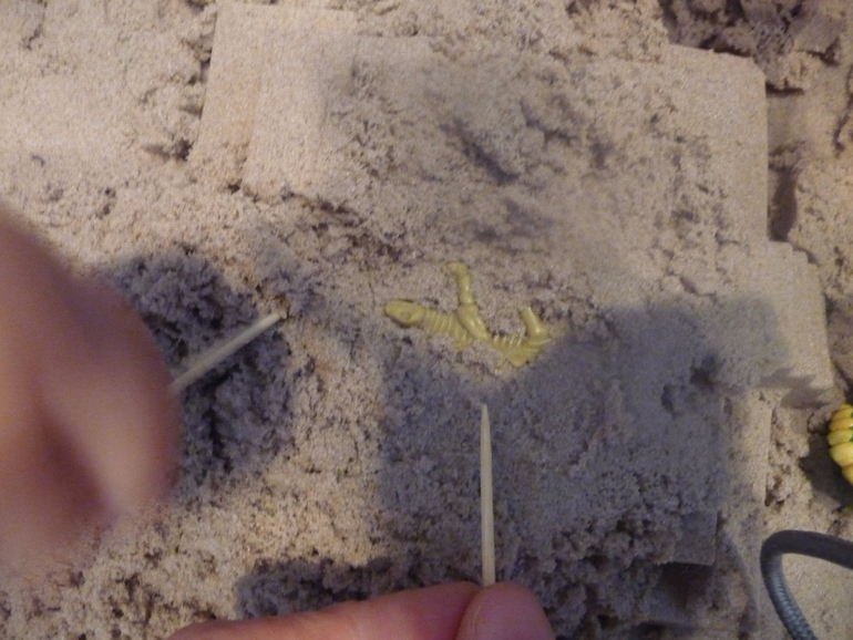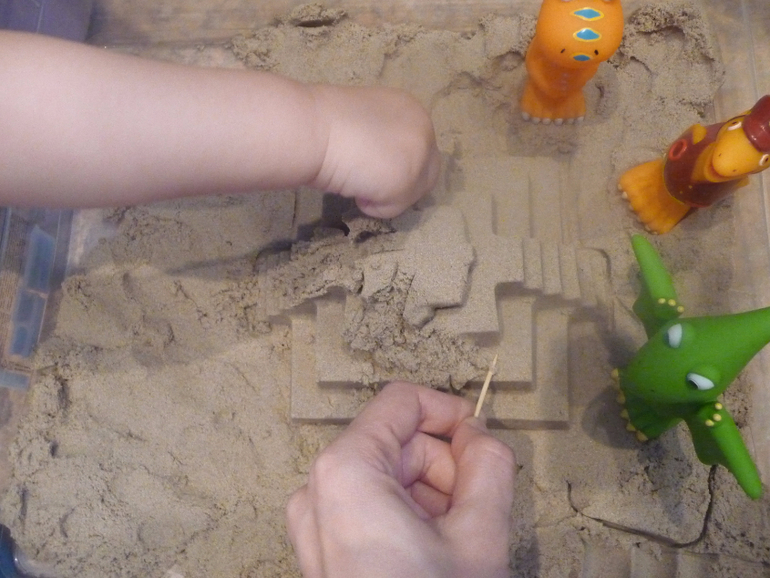 Ромка убежал смотреть бакуганов на компе, а мы с Алисой решили покопаться в песке. Сначала раскопали зубочистками скелет динозавра...