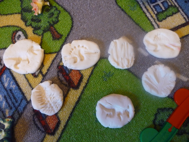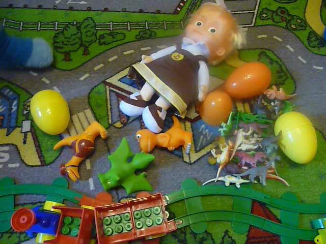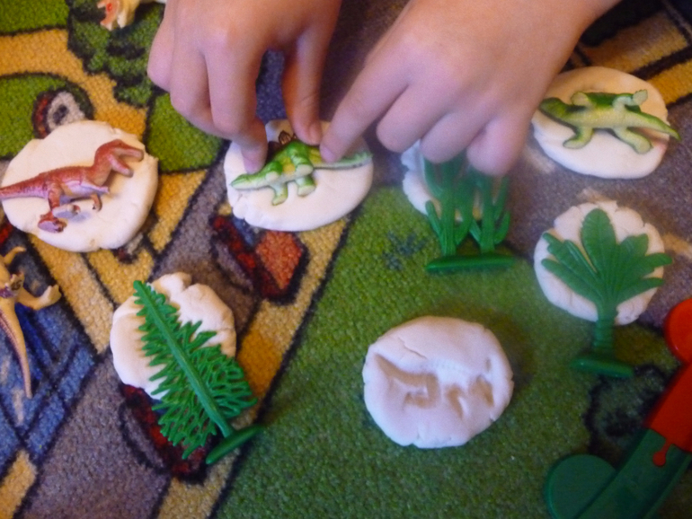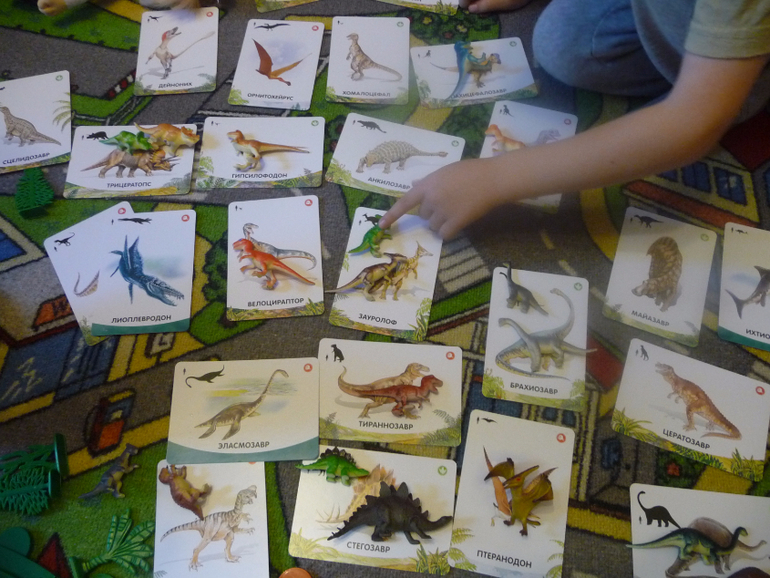 Дети с энтузиазмом бросились на поиски запрятанных мною в комнате разноцветных яиц с динозаврами и растениями внутри. Нашли много разных видов ящеров (Алиса нашла еще и Машу : )) и решили сверить их со слепками на камнях, а также рисунками на карточках.