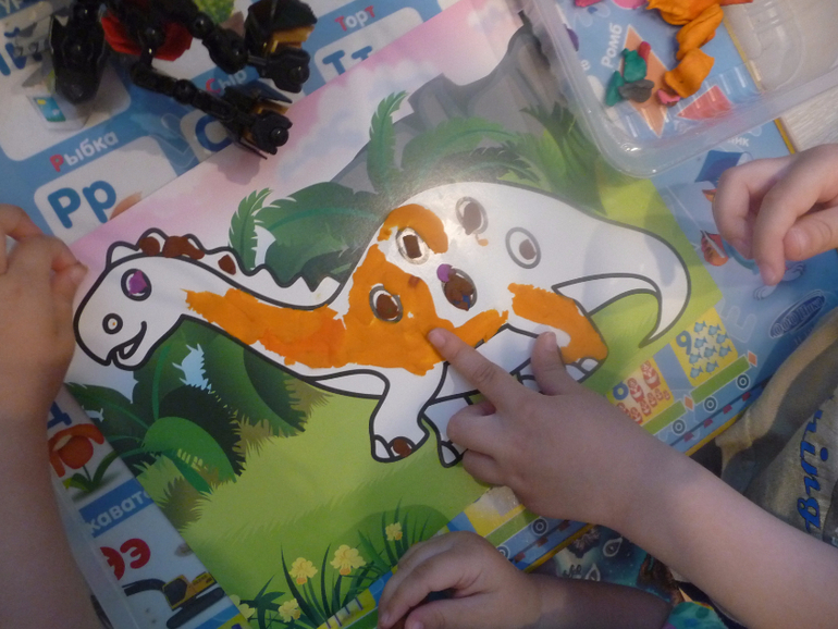 После этого решено было смастерить для папы пластилиновую картину. Позвали и Ромку на помощь.