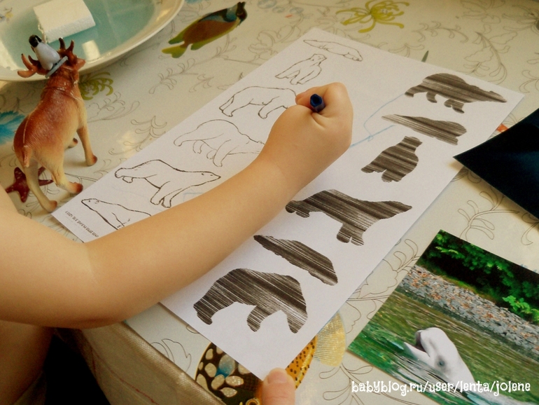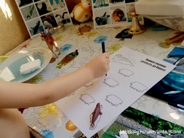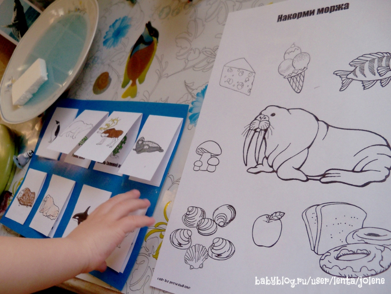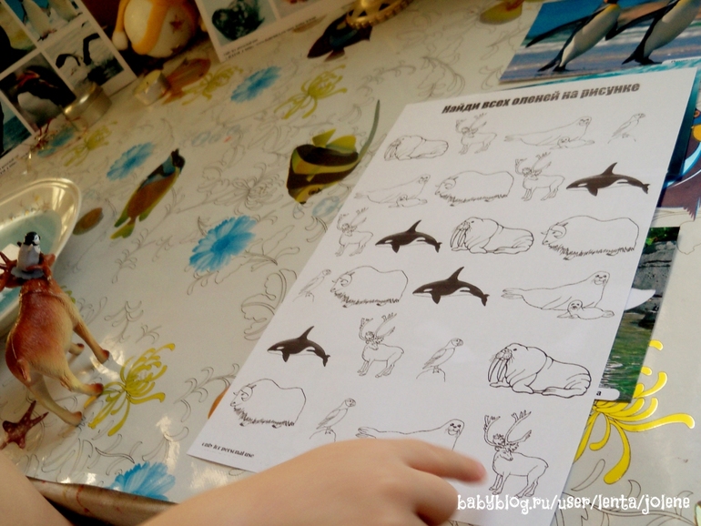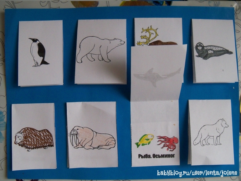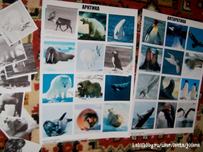 Потом мы рассмотрели карточки с обитателями Северного и Южного полюсов и сравнили их с теми, что прятались за льдинами.