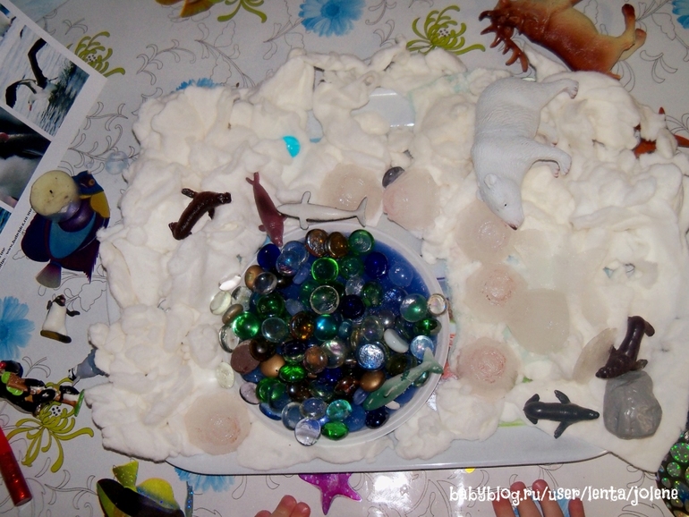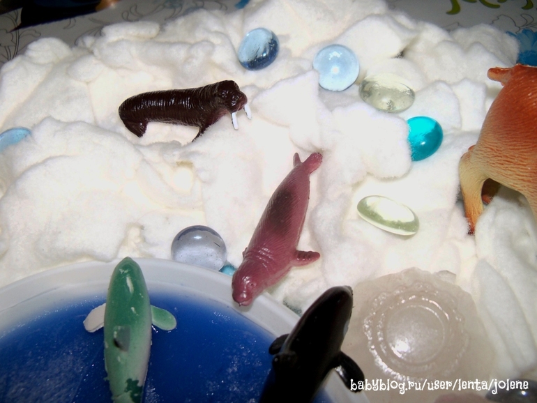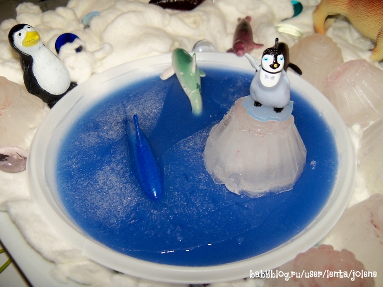 Основной наполнитель - вата. Еще льдинки, синие, голубые и прозрачные стеклянные камушки. В центре - желатиновый океан.