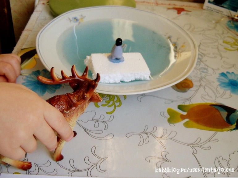 И вот Лоло отправляется в гости к бабушке. А т.к. идти ему совсем не хочется, то выбрано было самое доступное ему средство передвижения - льдина. Ребенок порадовался пингвину и увлеченно катал его на импровизированной льдине (пенопласт + подкрашенная вода).