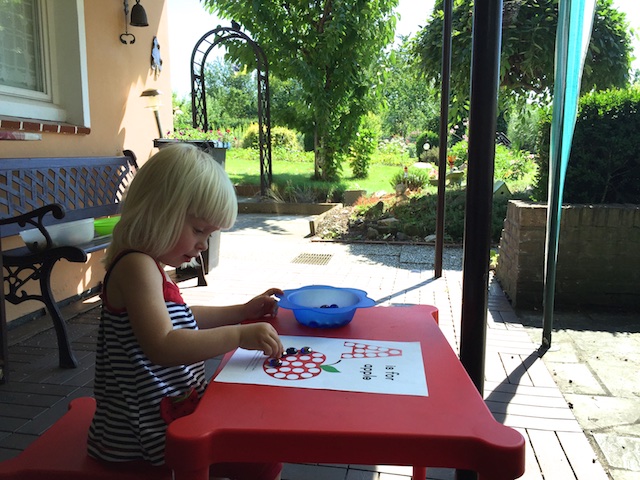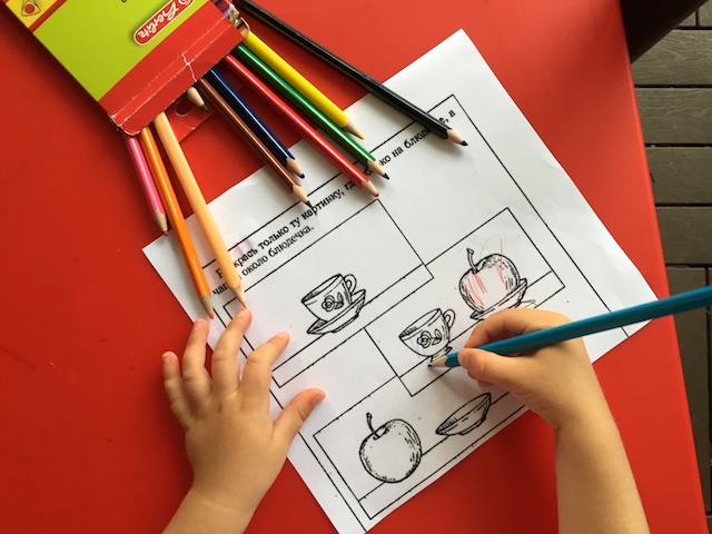 А на даче выполняли задания. Это у Насти любое развлечение: постоянно просит, сама уже достает свой столик и табуретку и ждет, когда же я разберусь, наконец, в бумажках))