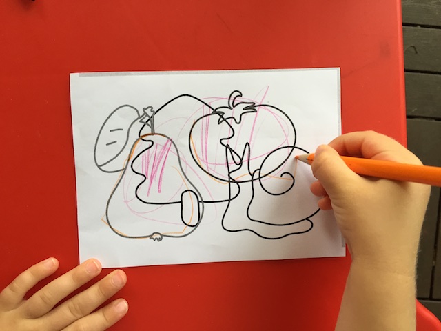 Новым для Насти было задание "распутать" картинки. Точнее, просто назвать, что нарисовано, я ей предлагала не раз и она всегда хорошо справлялась. Но сейчас, так как у дочки значительно повысилась точность в проведении линий, я попросила обвести каждый рисунок разными карандашами. Но пока еще ей трудно и быстро надоедает.