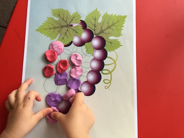 А виноград склевали птички, тоже попросил помочь. Пару месяцев уже очень хорошо идут такие задания с пластилином, где надо что-то доделать. Это задание скачивала с сайта mamadelki.ru, как и "счетный материал" - мишки с клубничками.