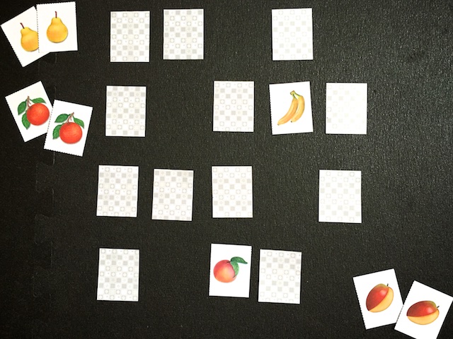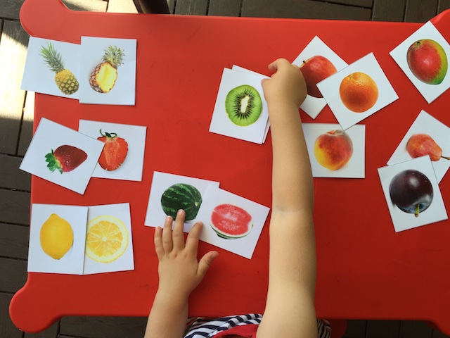 "Найди пару": целый фрукт (ягода) - половинка. Оказалось не так-то просто для Насти. Карточки с какого-то англоязычного сайта, если кому-то надо, пришлю.