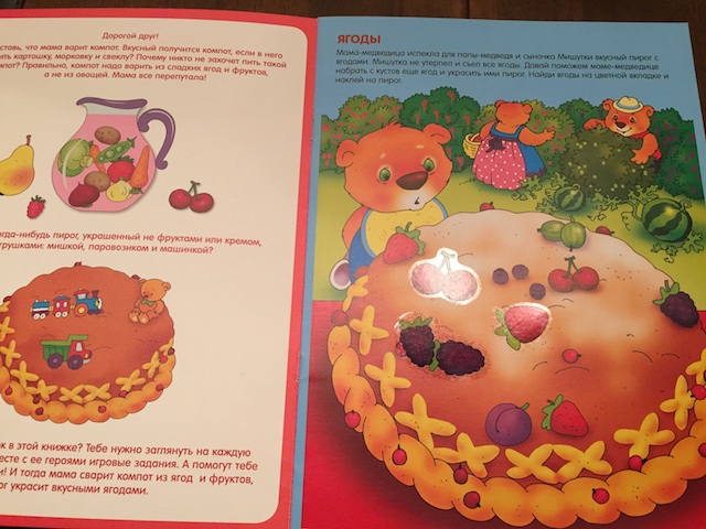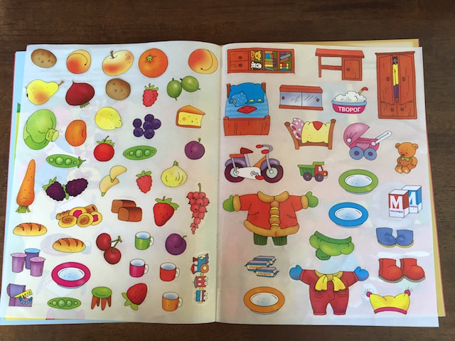 Дома, уже вечером, я предложила доче книжку с наклейками. Год назад наклейки у нее были просто хитом, потом интерес утих. Сейчас я достаю время от времени что-нибудь новенькое, тогда играет с удовольствием.