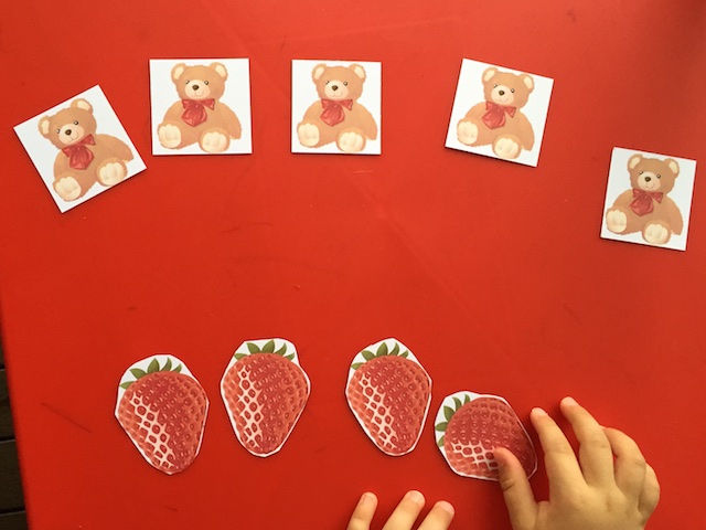 А кто же съел эти ягоды-фрукты? Маленький медвежонок. Очень он любит полакомиться, вот и друзей своих пригласил. Хватит ли им клубничек? Делали несколько раз с разными количествами в пределах пяти (математика). Недавно начали так играть, пока не всегда у Насти получается ответить правильно.
