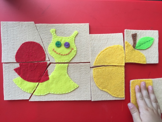 А улитка и сама "растерялась", и яблоко попросила ей собрать. Самодельные фетровые пазлы. Пазлы Настена не очень любит, тренировки мало, поэтому даже с такими пришлось немного помочь.