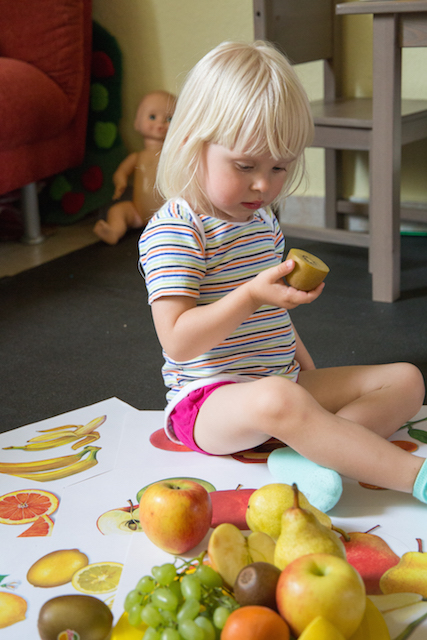 Насте очень понравилось по моей команде искать ягоды-фрукты-овощи. Теперь каждый раз играем так во время шоппинга. Накупили разных вкусняток (для меня): яблоки, груши, абрикосы, манго, ежевику и компанию. Дома устроили "лабораторию": разрезали фрукты-ягоды, смотрели, где есть косточки, дегустировали. Пробовать по-настоящему Настя отказалась, согласилась только на киви, но каждый фрукт лизнула и почти про все сказала "вкусно"))) Такая "лаборатория" у нас теперь случается после каждого похода в магазин.