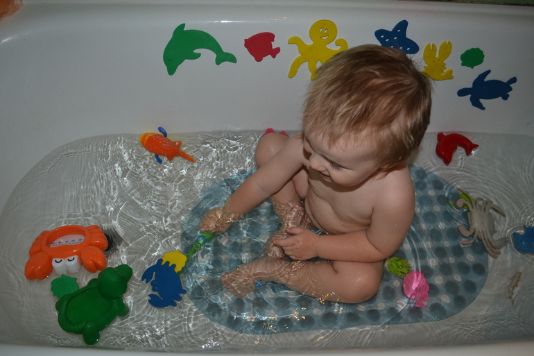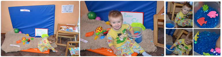 Утром проснувшись, я достала наше импровизированное море из гидрогеля, и показала как шарики выросли. В море я прятала рыбок, а Даня искал их. Затея ребенку очень понравилась, он довольно долго копался в море. В течение этого времени приходилось следить, чтобы гидрогель не был раскидан по всей квартире. Наигравшись руками, мы устроили рыбалку в море.