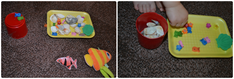 Сначала среди ракушек, Даня выбирал рыбок, потом наоборот.