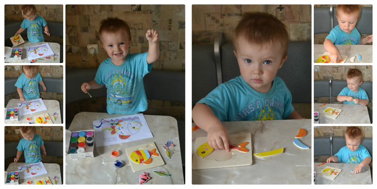 Следующим заданием было сложить деревянный пазл рыбка. Сейчас для сына он еще сложноват, собирать пытается но без помощи мамы не получается, но у него еще все впереди. У нас в арсенале еще есть деревянные пазлы вкладыши рыбки и вкладыши из мягкого полимера с которыми мы купаемся. Играем с ними уже довольно долгое время, поэтому собирал их Даня без особого энтузиазма.