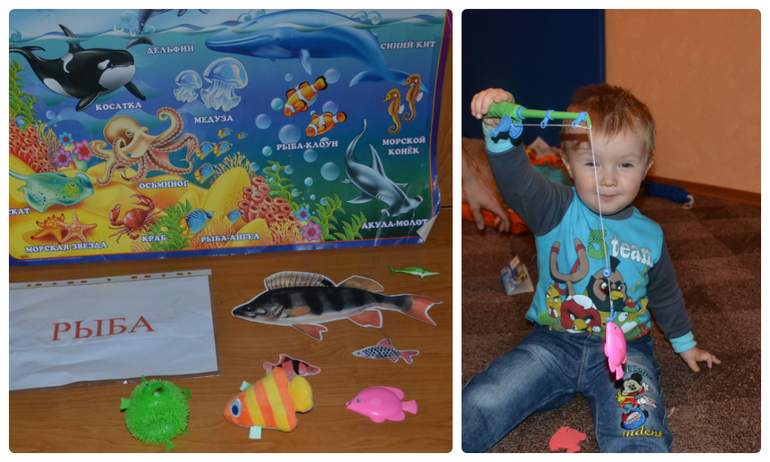Дальше мы рассматривали рыбок искали их в книге, на плакате. Потрогали, пощупали все виды рыб которые я приготовила: бумажные которые я распечатала, пластиковую из комплекта рыбалки, тканевую мягкую и пищащую, резиновую и светящуюся - рыбу еж, рыбку - вкладыш из мягкого полимера.