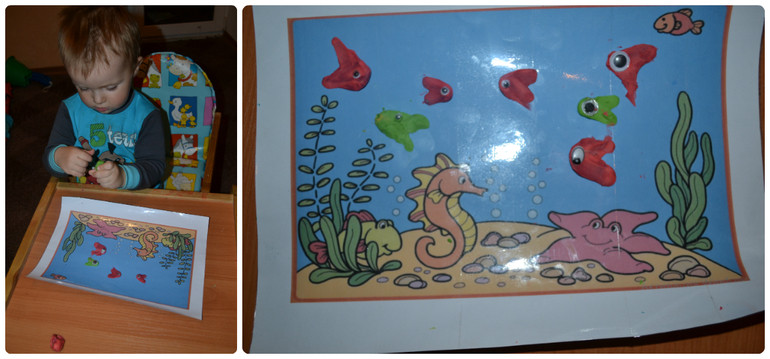Для занятия с пластилином я распечатала страничку - морское дно из книжки «Это может Ваш малыш -Учимся лепить» и обклеила ее скотчем. Подготовила заготовки шариков из пластилина и достала пластиковые глазки (заранее мной купленные). Даня просто обожаем заниматься с массой для лепки и пластилином, поэтому игру воспринял с интересом.