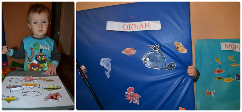 Для игры я обвела вырезанных рыбок по контуру ручкой, а убрав шаблон, обвела карандашом верху маркером. Рыбок оказалось многовато для первого раза, без маминой помощи до конца сам не справился. Интерес пропал быстро, и тогда я предложила их отпустить в Наш океан идея была принята на ура. В первый день мы клеили рыбок с помощью скотча. Сначала Даня клеил рыбок, через какое - то время подходил и отрывал их, потом снова клеил.