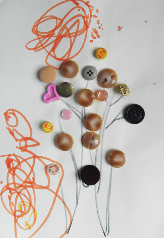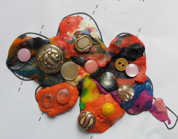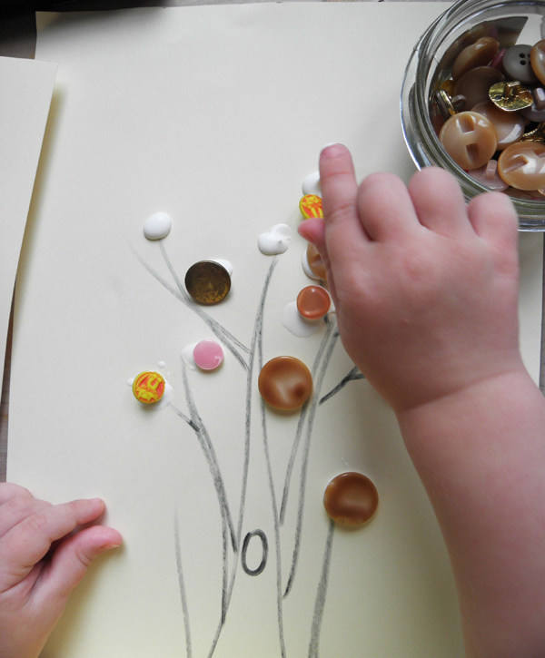 Приклеивает пуговки на осеннее дерево и украшает пластилиновый листик дуба: