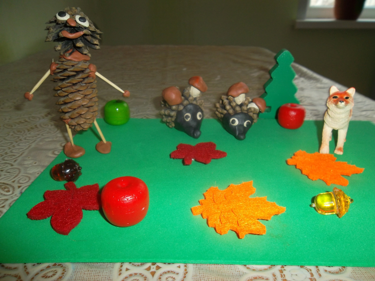 Делали поделки из природного материала, вообще творчества было много. Вот такой старичок лесовичок появился у нас, а вместе с ним и семейка ежей, делала, в основном мама (Рома катал колбаски)