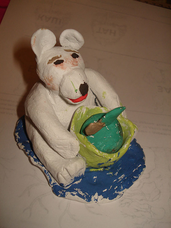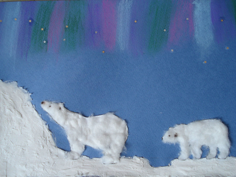 Делали вместе. Творческую работу мы сделали акварельной бумаге. Льды сделали из мокрых салфеток (почти папье-маше), на силуэты мишек наклеили вату. Пастелью нарисовали северное сияние и наклеили звездочки - созвездия малой и большой медведиц (заодно посмотрели их изображение на звездном небе).